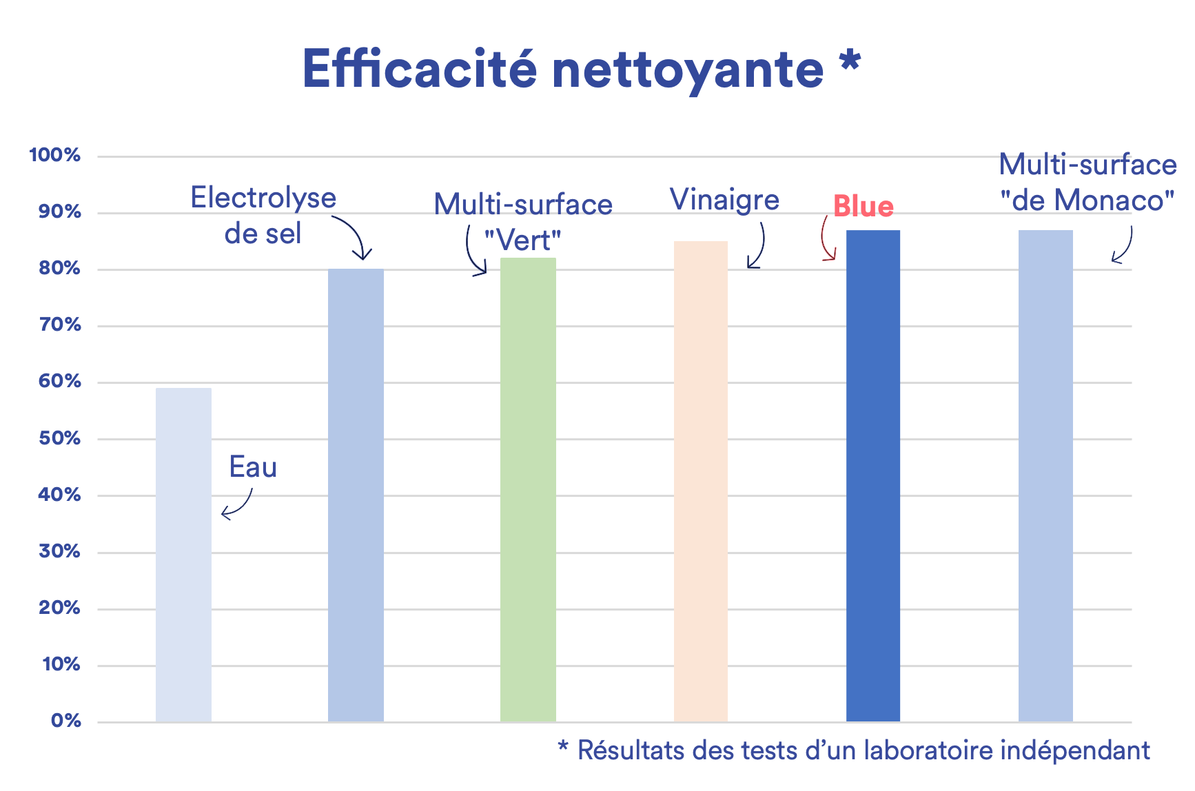 Blue est un désinfectant et détergent certifié en l’état sans que vous n'ayez besoin de faire de savants dosages ou de risquer de vous brûler lors de la préparation.